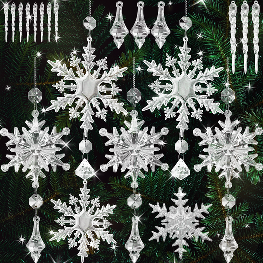 ULLIKI Christmas Tree Decorations Sets - Icicle Ornaments, Snowflake Decorations, and Clear Acrylic Hanging Crystals for an Enchanting Festive Xmas and New Year Celebration