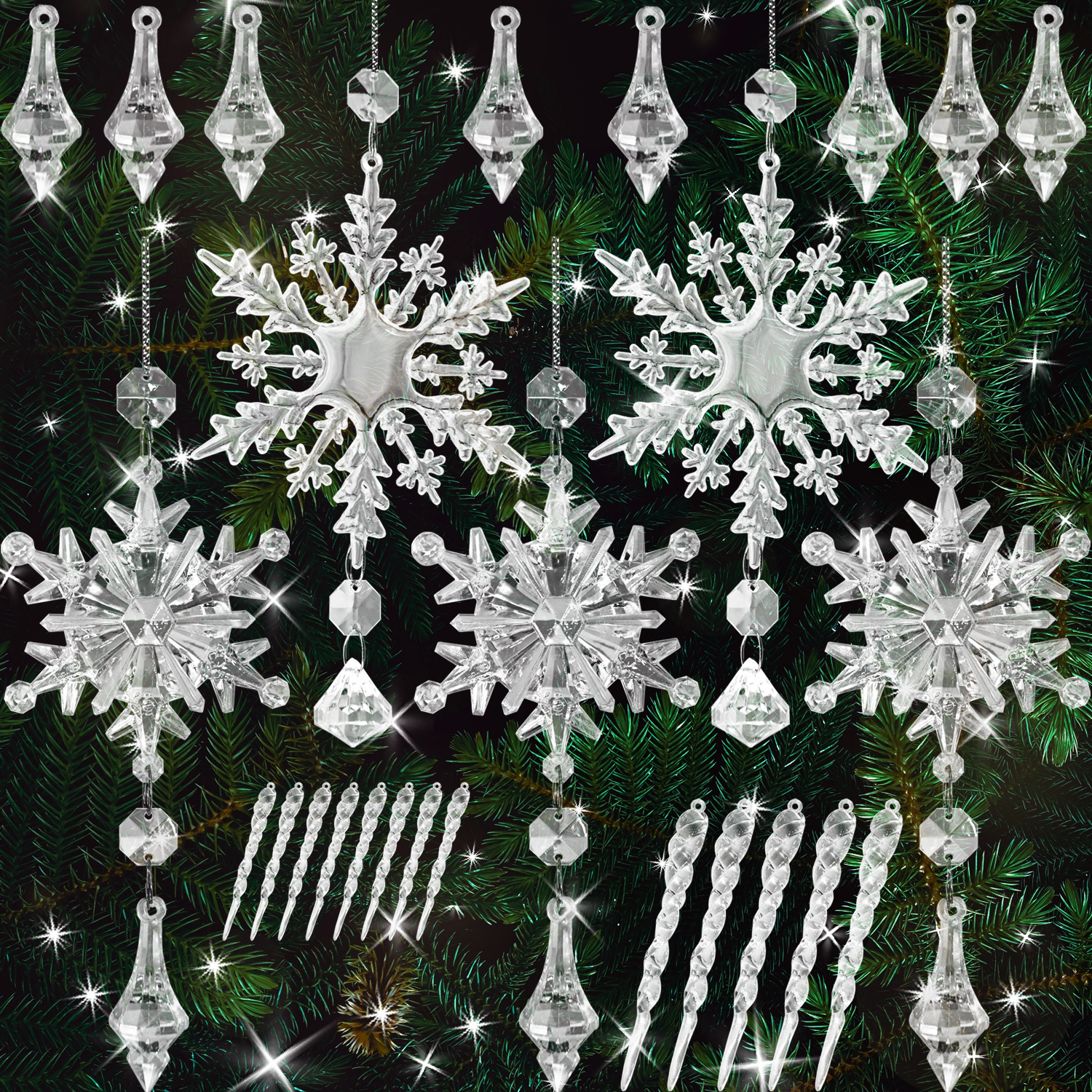 ULLIKI Christmas Tree Decorations Sets - Icicle Ornaments, Snowflake Decorations, and Clear Acrylic Hanging Crystals for an Enchanting Festive Xmas and New Year Celebration