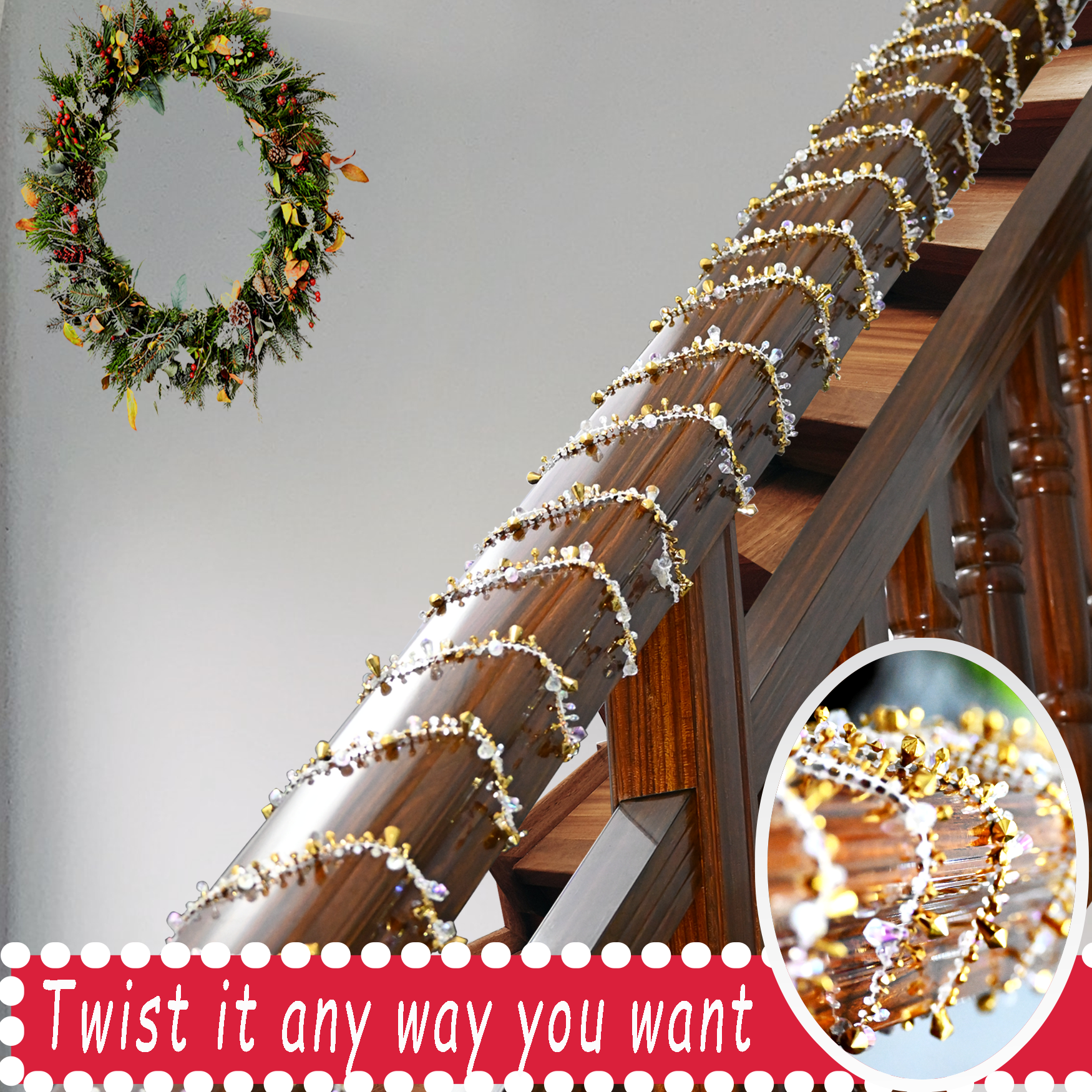 Unleash your imagination and let the garland work its magic in a variety of settings. Hang it on your Christmas tree, decorate your door, wall or balcony, festive table or add a touch of elegance to your banister. Its versatility extends beyond Christmas, making it ideal for birthdays, weddings.